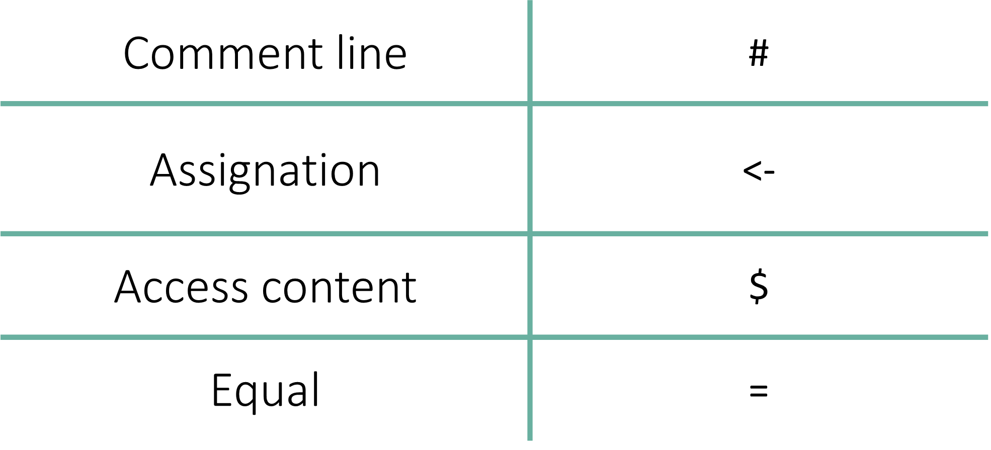 The standard way to assign values in R is using the <- operator. Think of it as an arrow pointing from the data to the label.