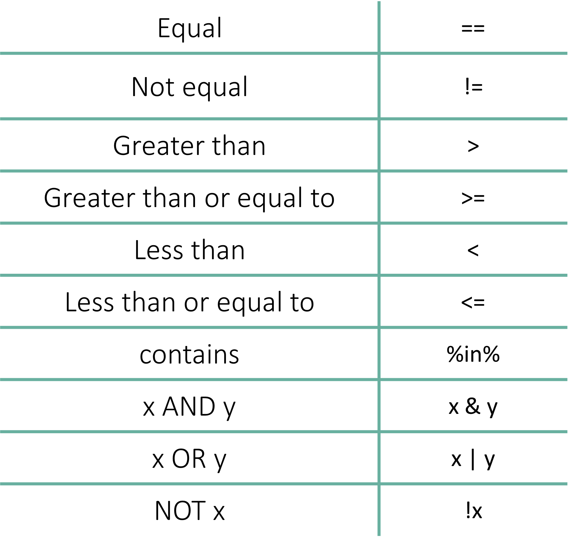 The %in% operator (often called “contains”) is extremely useful when you want to check if a value belongs to a large list or group.