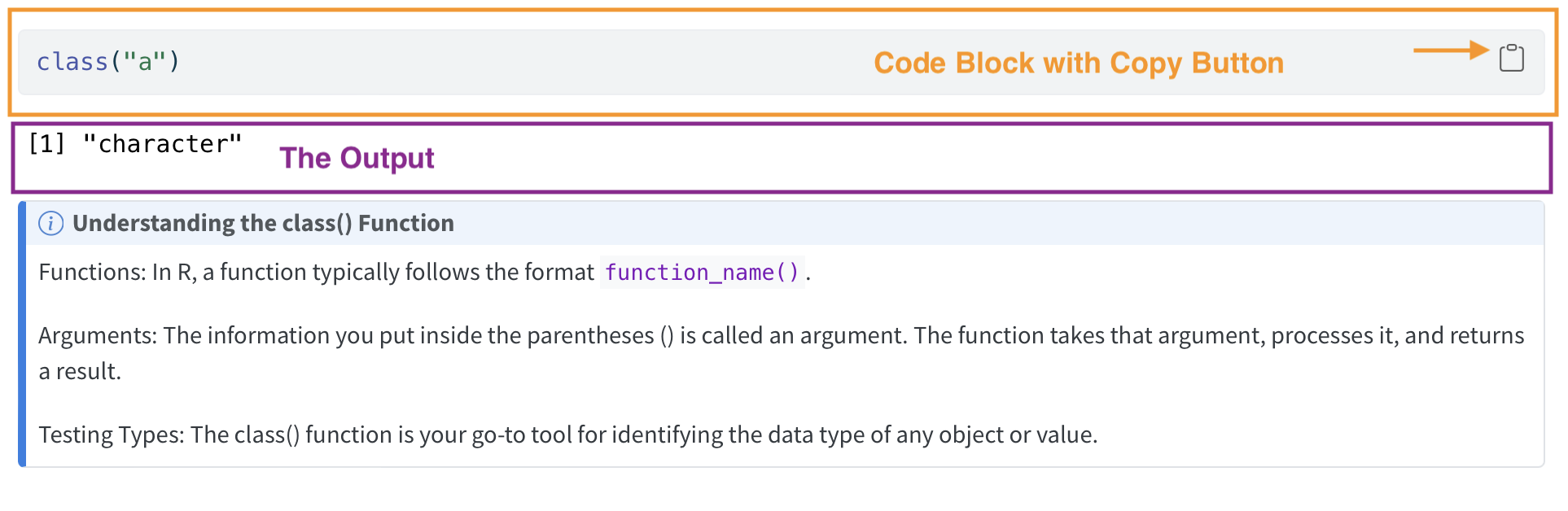 Immediately following the code block, you will see the results. These lines represent the exact output you will see in your RStudio Console on your own computer.